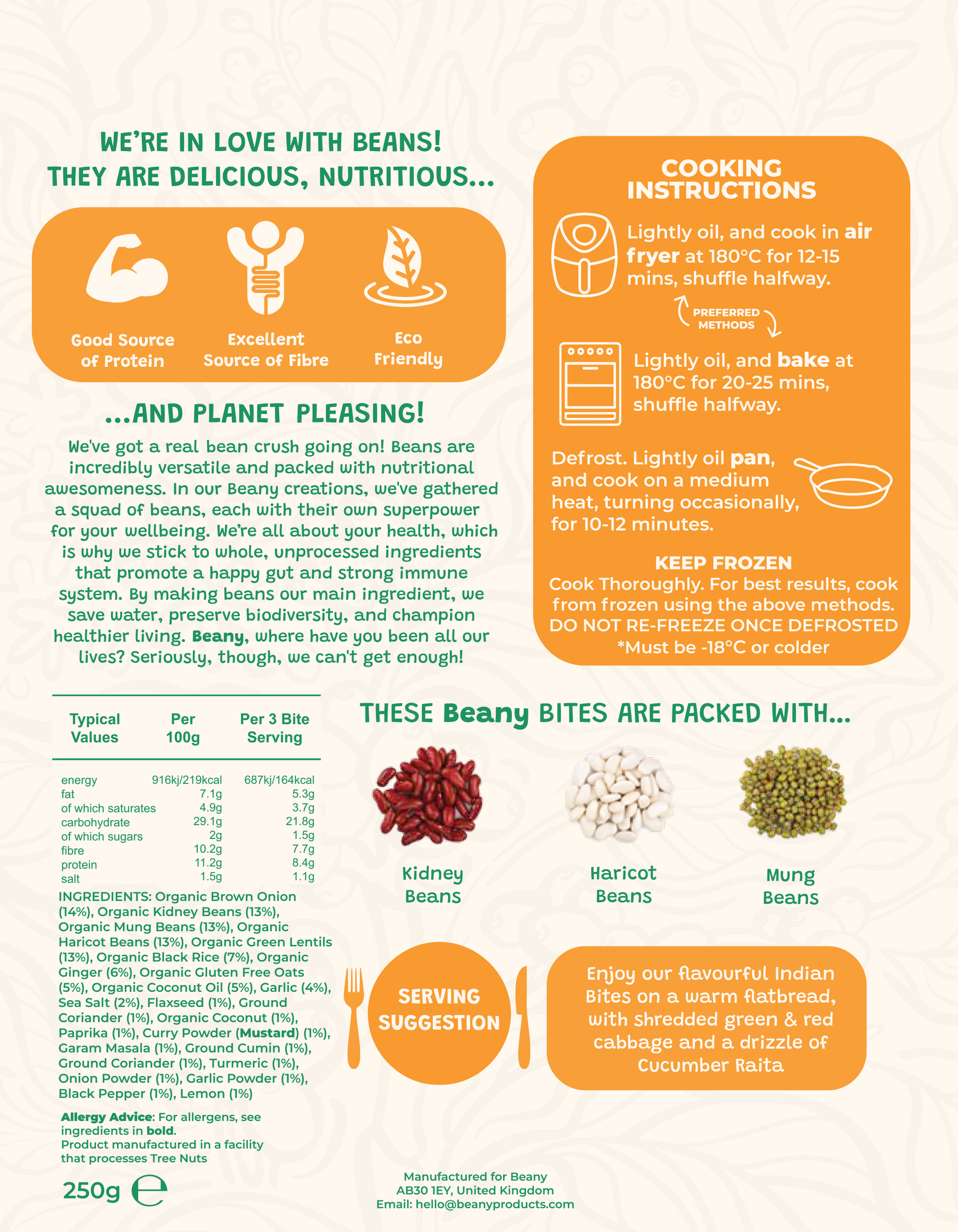 Immerse yourself in the vibrant world of Indian Fusion with our delectable Bean Bites. Bursting with a harmonious blend of Mung Beans, Kidney Beans, and Haricot Beans, each bite is a tantalising fusion of zesty ginger, fragrant coriander, tangy lemon, and creamy coconut, all interwoven with an array of authentic Indian spices. Prepare to embark on a culinary journey like no other.
