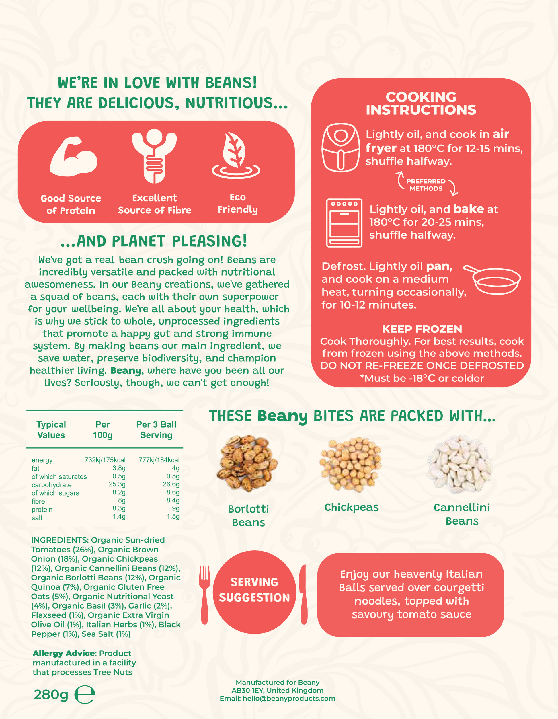 Organic Chickpeas, Organic Borlotti Beans, Organic Cannellini Beans, Organic Quinoa, Gluten Free Oats, Organic Sun Dried Tomatoes, Onion, Garlic, Nutritional Yeast, Italian Herbs, Onion Powder, Garlic Powder, Salt, Black Pepper